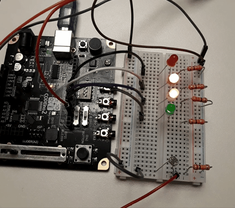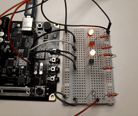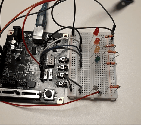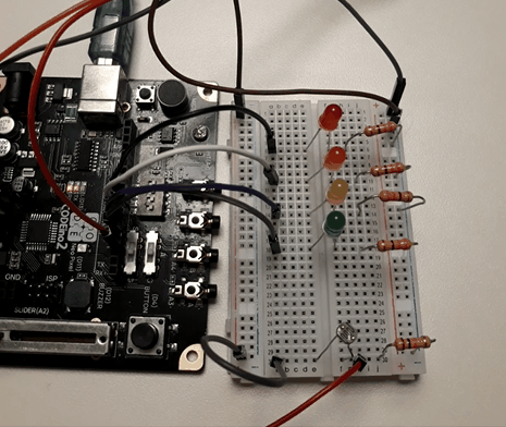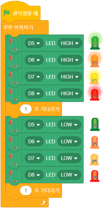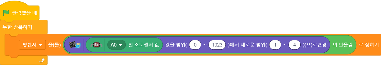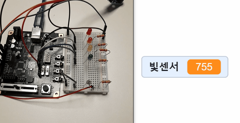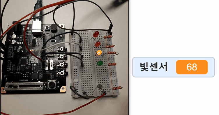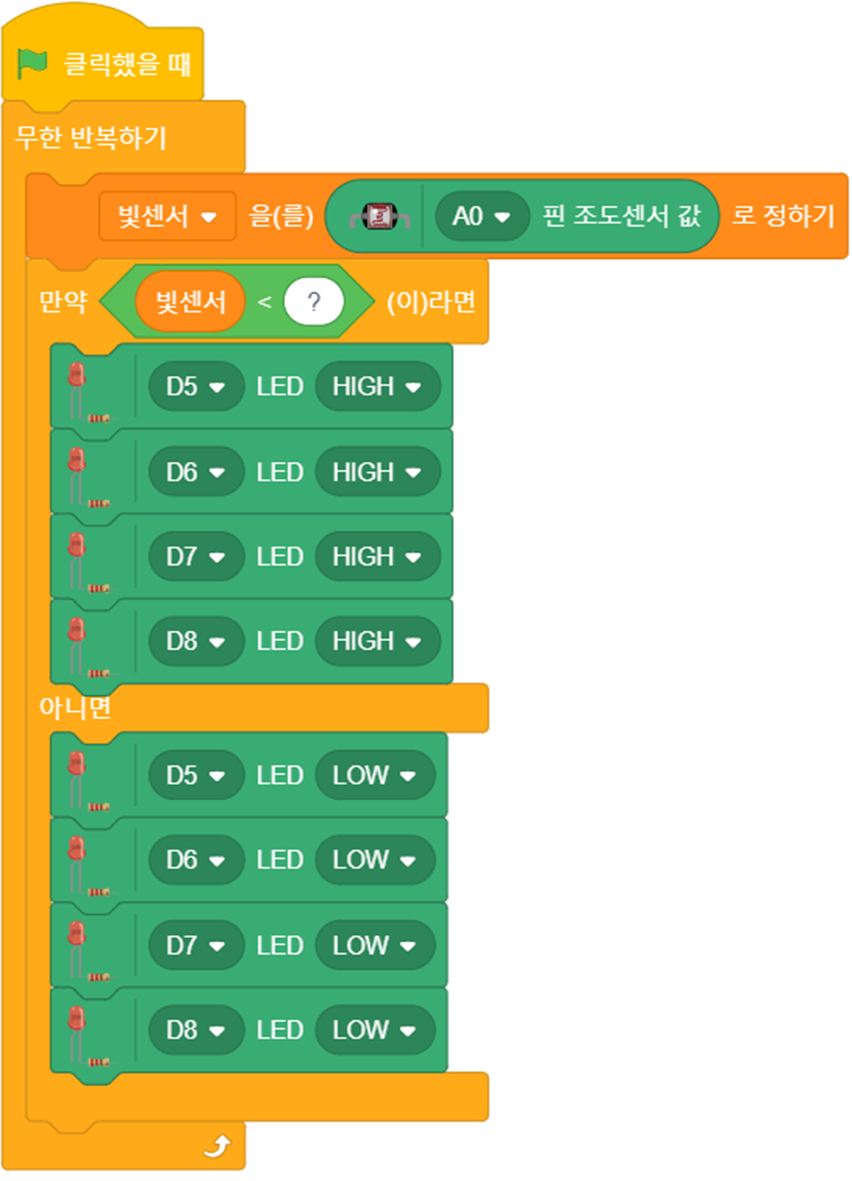 - 즉, 빛 센서를 손으로 가리면 LED가 1개씩 점점 켜집니다.