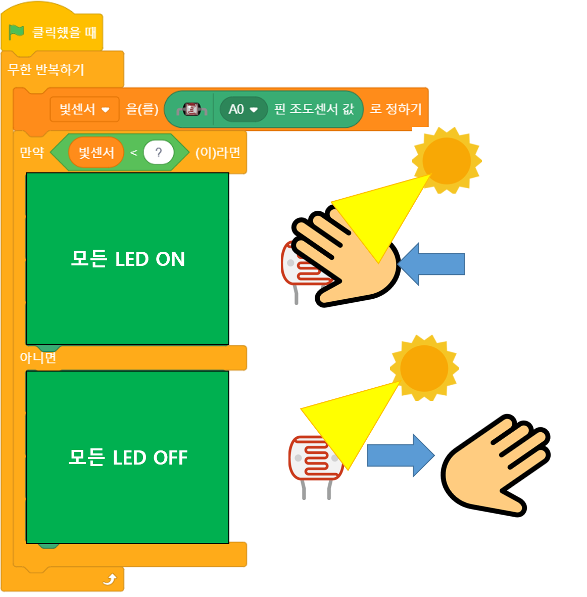 [퀴즈] 빛센서를 손으로 가리면 LED 4개가 모두 켜지고(All on), 손을 떼면 LED 4개가 모두 꺼지는(All off) 동작을 코딩해 보세요.