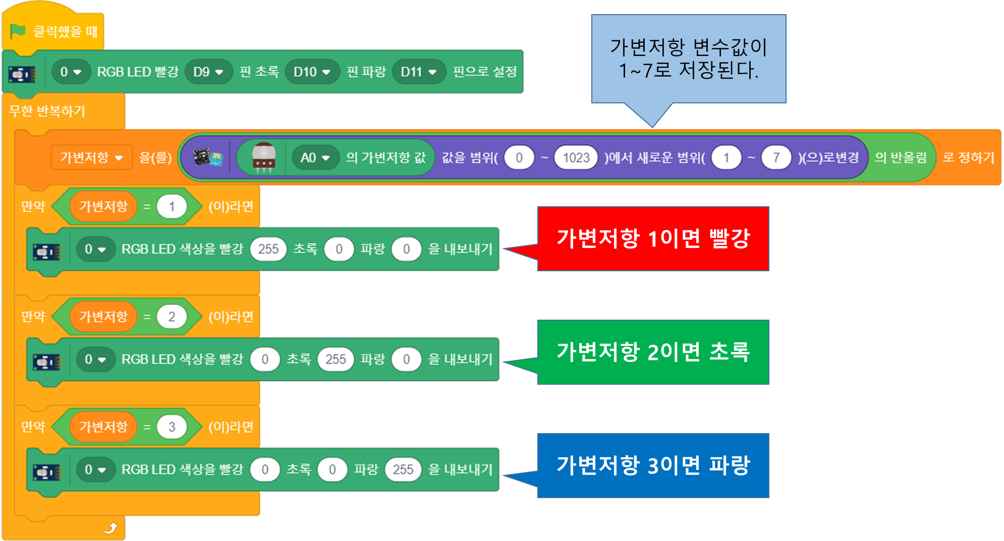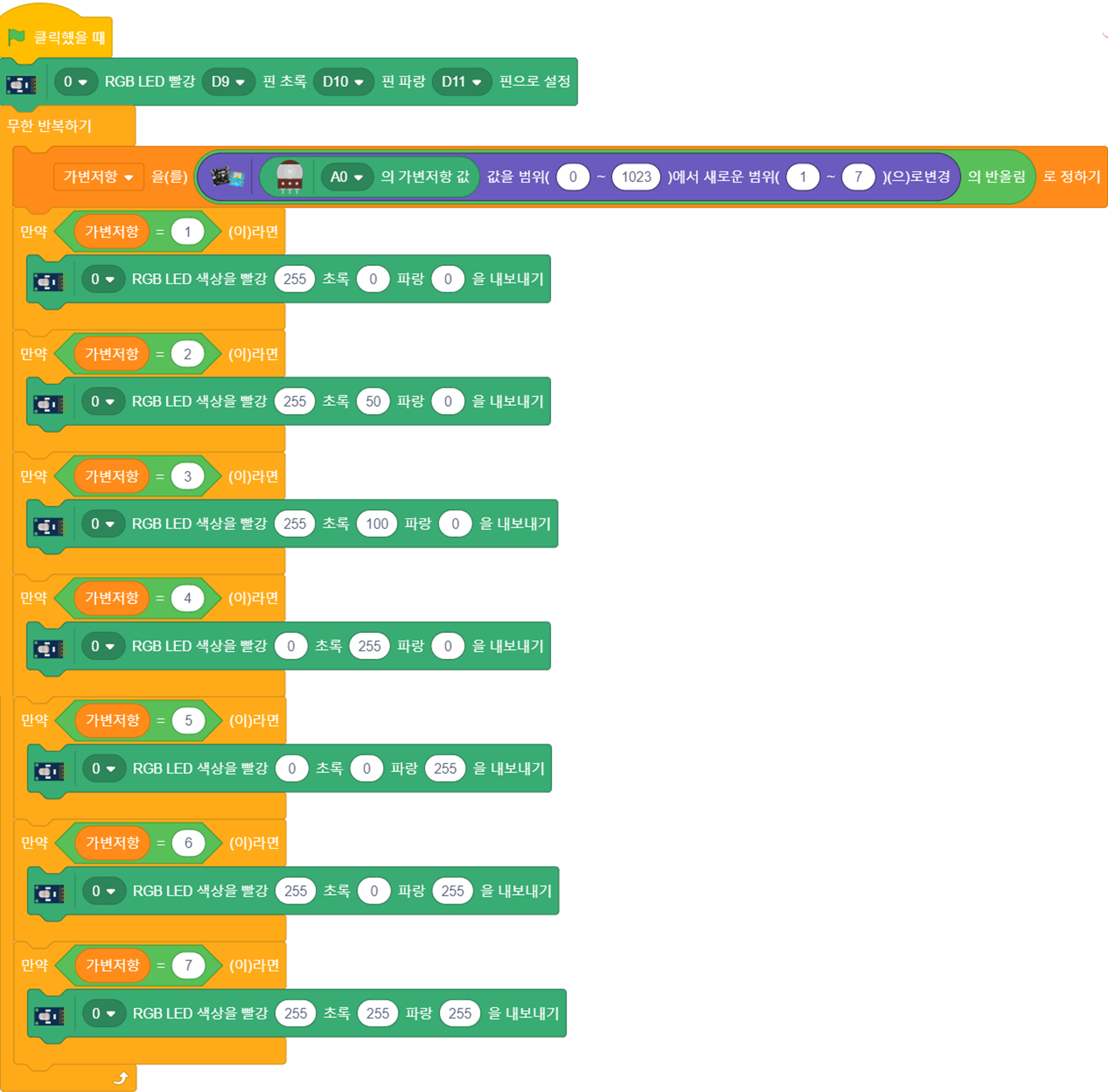 가변저항을 돌리면 아래의 값에 맞춰 컬러 LED의 색깔을 코딩하세요.