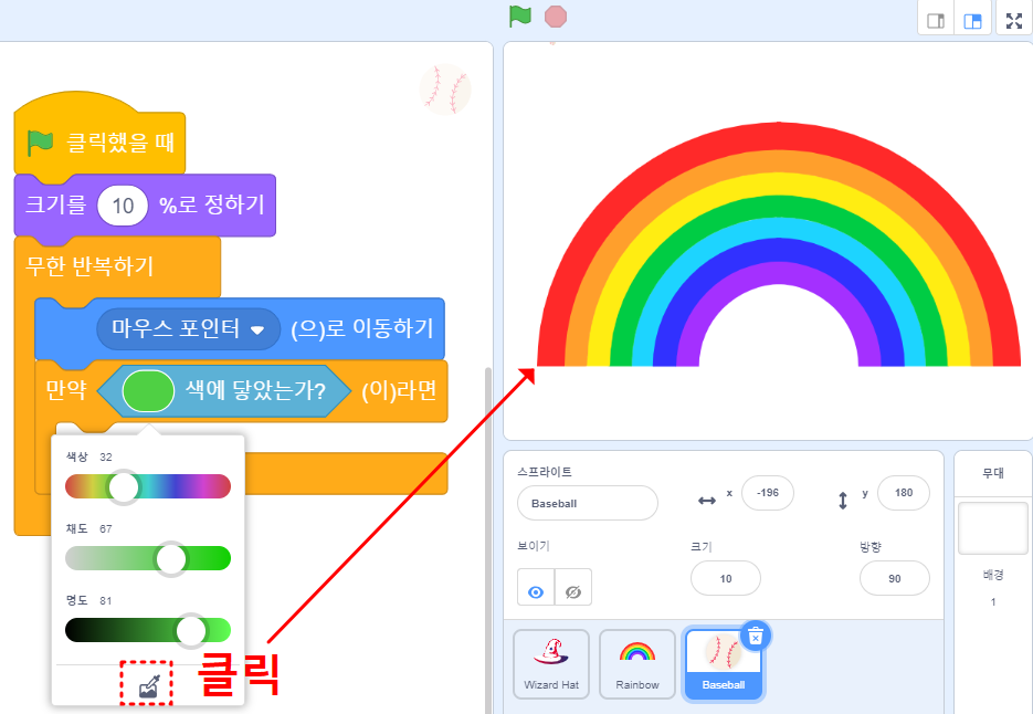 (4) Baseball 스프라이트가 마우스를 따라다니게 코딩하고, 색깔 닿기를 아래 그림과 같이 코딩하기