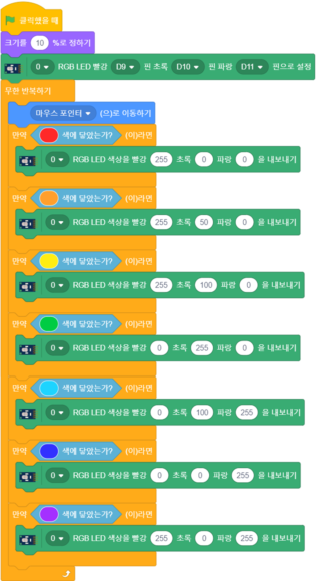 다른 무지개 색깔에 마우스 포인터(Baseball)가 닿으면 그 무지개 색깔이 컬러 LED에 나타나도록 코딩해 보세요.