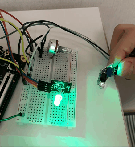 - 적외선 동작감지 센서에 물체가 감지되면 컬러 LED의 색깔이 파란색이 됩니다.