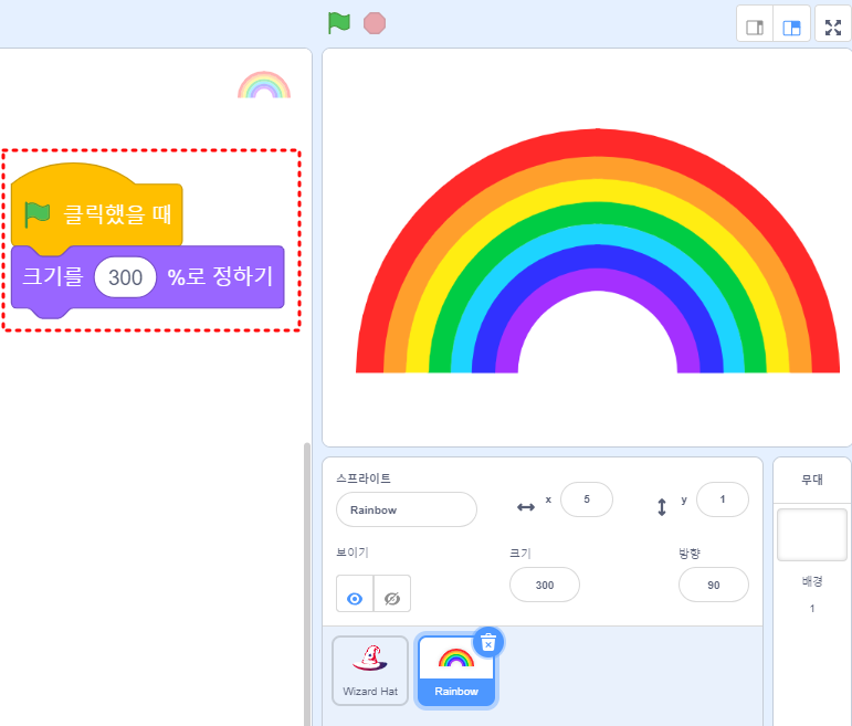 (2) 무지개 스프라이트 가져오고, 크기 300%로 코딩하여 녹색깃발 누르기