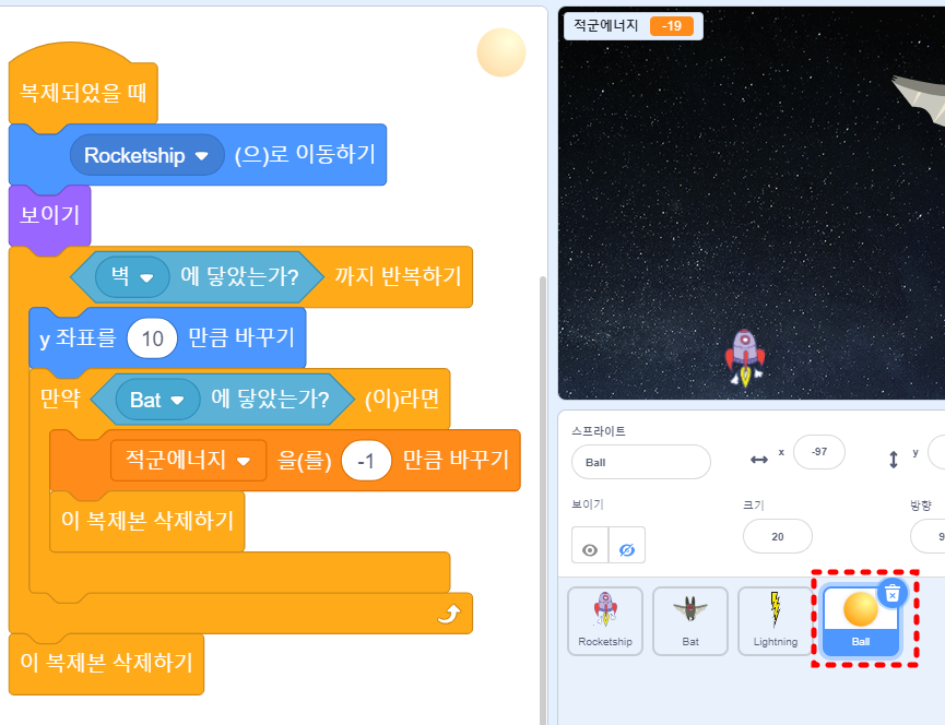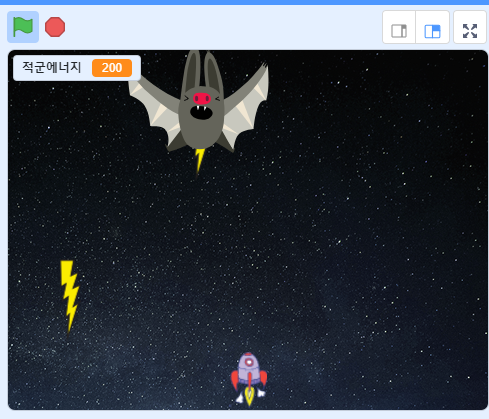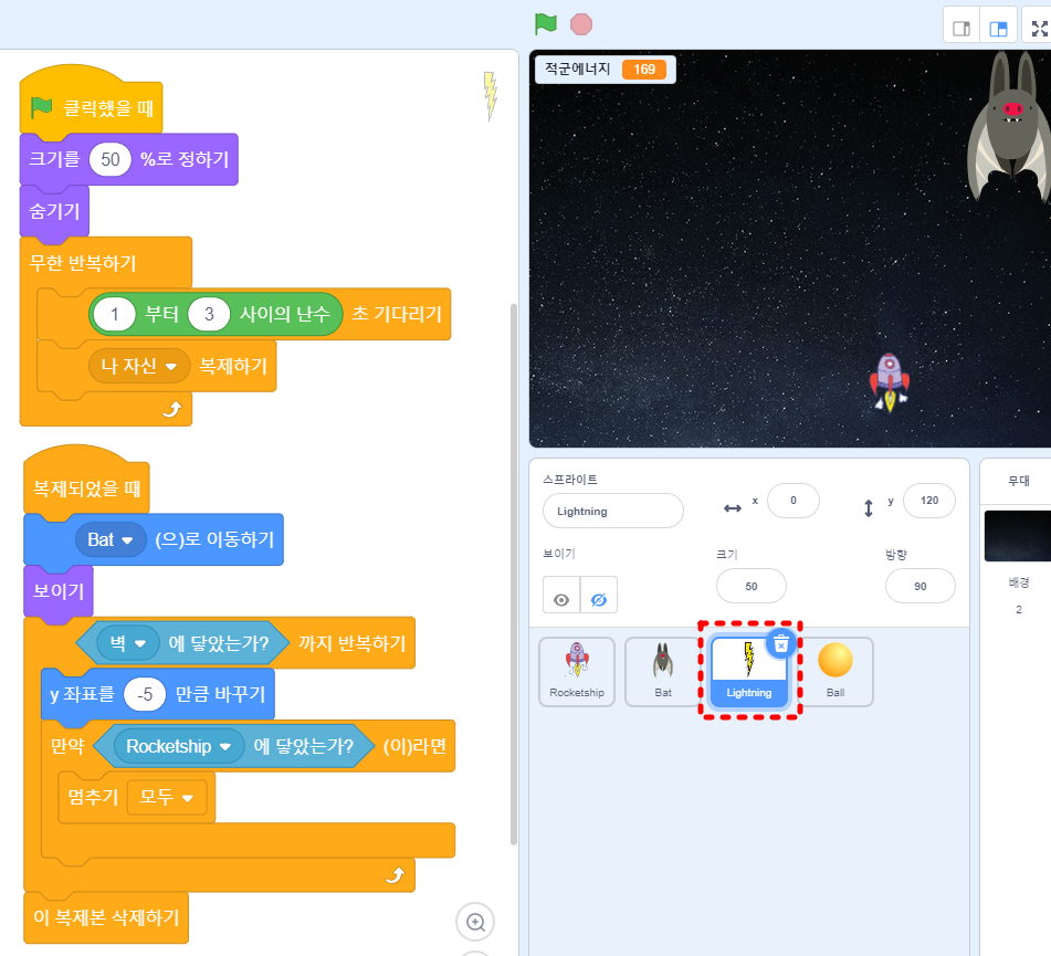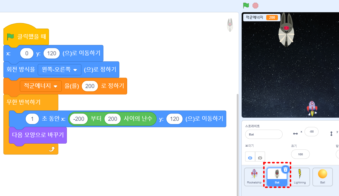 (3) Bat 적군이 죽으면(적군에너지 = 0), 또 다른 적군 스프라이트가 나타나고, 배경의 모습이 바뀌게 해주세요.
