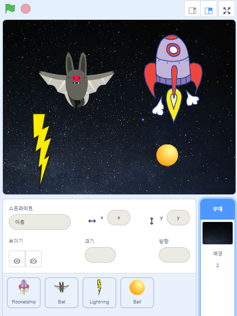 (2) Rocketship이 번개에 맞으면 "Game Over" 글자가 화면에 나타나게 하세요.ㅣ