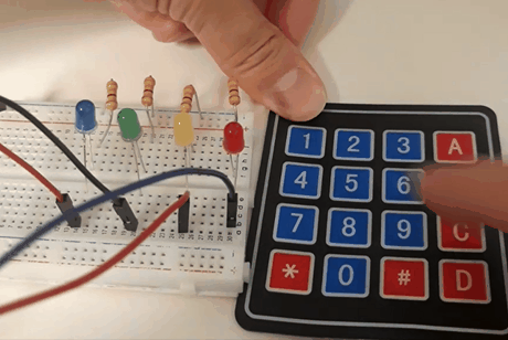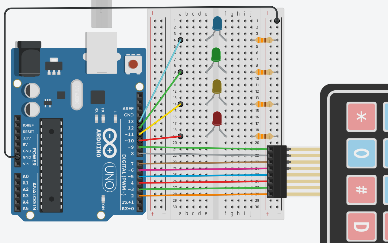 - 키패드 '1', '2', '3', 'A' 를 누르면 각각 LED 10번, 11번, 12번, 13번핀이 ON 됩니다.