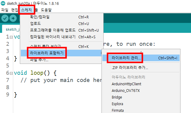[1] 스케치 > 라이브러리 포함하기 > 라이브러리 관리를 클릭합니다.