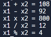 🏴 [유제 1] 정수형 변수 x1 = 100, x2 = 8 일때 산술 연산자를 이용해 아래와 같이 출력하는 프로그램을 만드세요.