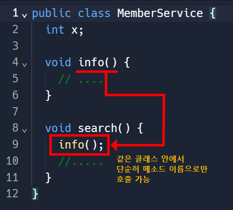 - 클래스 내부의 메소드를, 같은 클래스 내부에서 호출할 경우에는 단순히 메소드 이름으로 호출하면 된다.