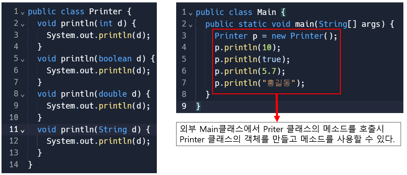 - 클래스 안에 같은 이름이 메소드를 여러 개 선언하는 것을 메소드 오버로딩 이라고 한다.