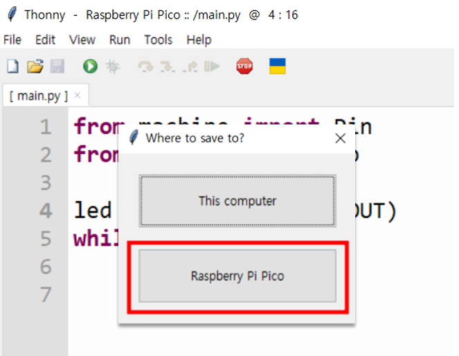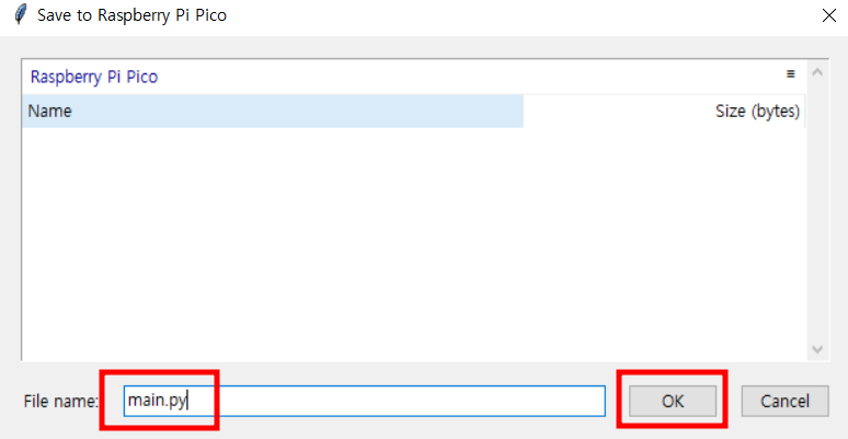 (파일 이름을 지정할 때 main.py로 해야 Pico를 부팅 시 해당 파일을 자동으로 실행합니다. 다른 이름으로 지정하면 파일이 저장은 되지만 부팅 시 자동으로 실행되지 않습니다.)