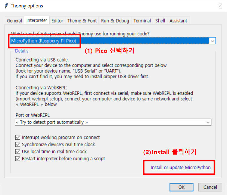 [4] Thonny options 화면 상단 메뉴에서, Interpreter를 선택하고, 아래 그림처럼 Pico를 선택, 그리고 Install 글자부분을 클릭합니다.