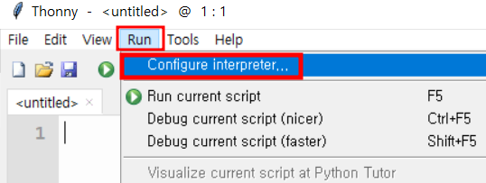 [3] Thonny의 상단 메뉴에서 Run > Configure interperter를 클릭합니다.