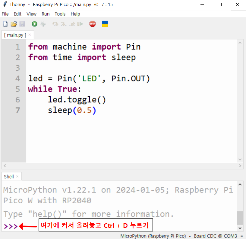 1 2 3 4 5 6 7 8 | from machine import Pin from time import sleep led = Pin('LED', Pin.OUT) #그냥 pico인 경우 'LED' => 25 while True: led.toggle() sleep(0.5) | cs |