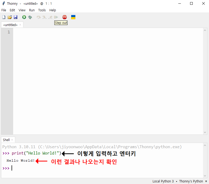 [13] 아래와 같은 창이 뜬다면 Thonny가 잘 실행된 것입니다. Shell 창에서 아래 그림과 같이 print("Hello World!")를 입력하고 엔터키를 쳤을 때 글자가 잘 뜨는지 확인해 봅니다.