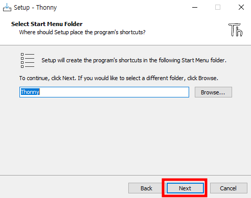 [6] Thonny 설치장소를 확인하고 Next를 누릅니다.