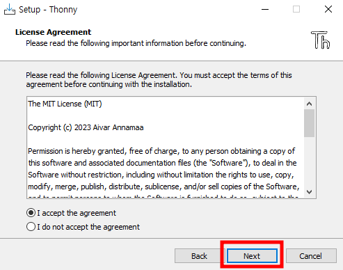 [7] 윈도우 시작메뉴에 Thonny 실행 아이콘을 두는 화면입니다. 그냥 Next를 누릅니다.