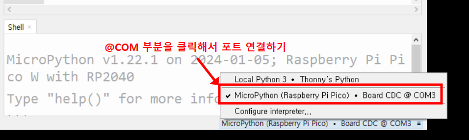 [7] 아래 그림처럼 Thonny 오른쪽 아래 부분에 COM포트 부분을 클릭해 주어야 연결이 제대로 됩니다.