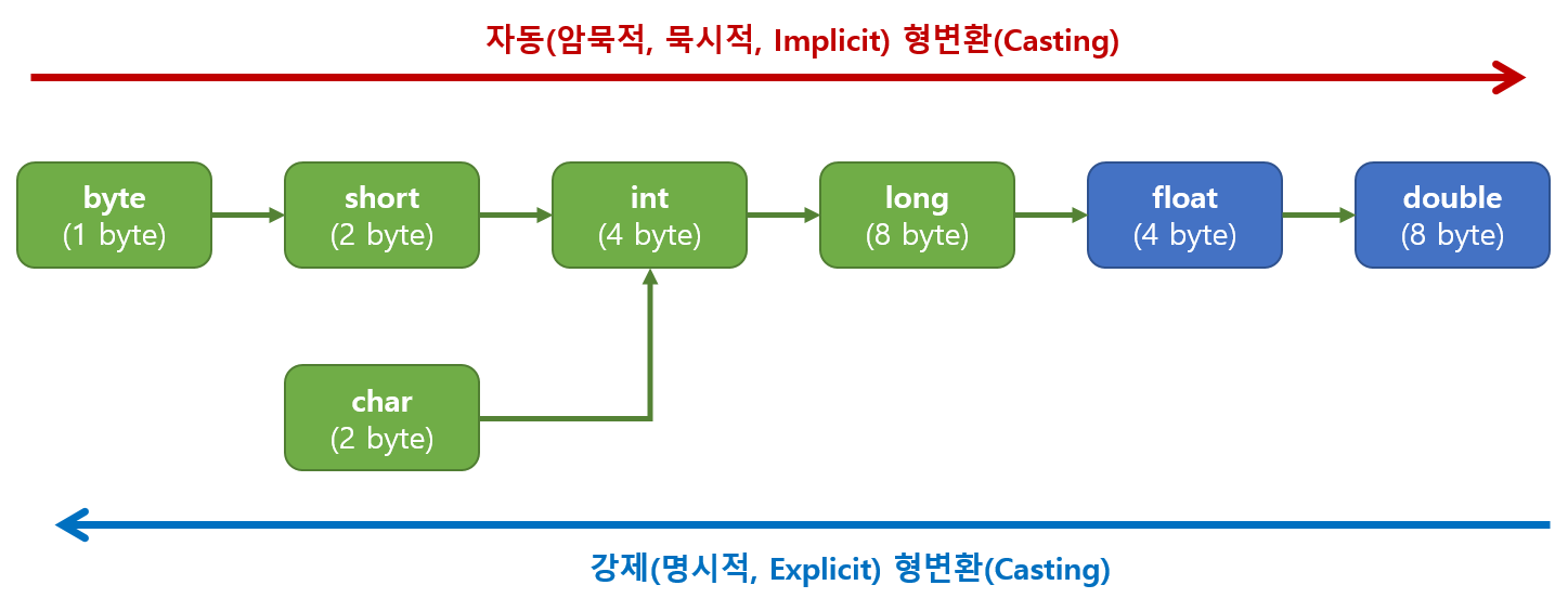 - 자동(암묵적, 묵시적, implicit) 형변환: 컴파일러가 자동으로 변환