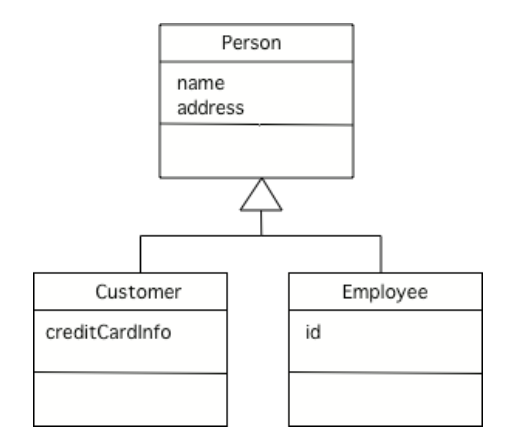 - 예를 들어, Customer와 Employees 클래스가 name과 address라는 field를 공통적으로 사용한다면, 아래 그림과 같이 Person 클래스를 만들고 그 안에 name과 address field를 넣어두고 상속 관계를 만들면 됩니다.