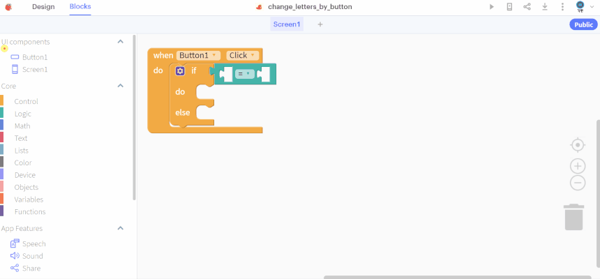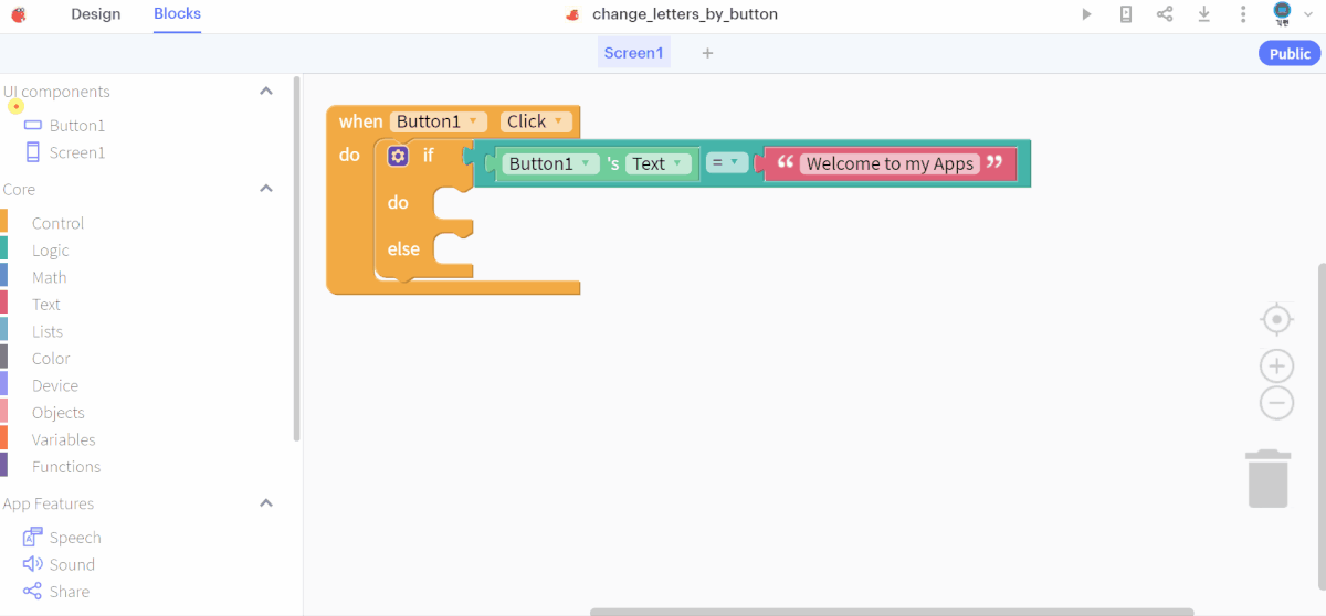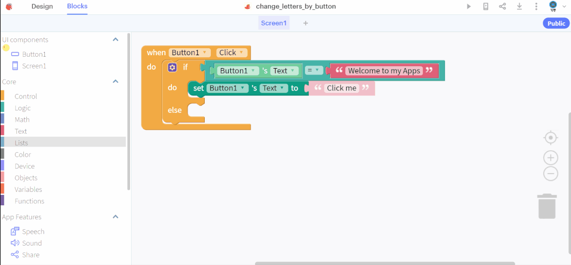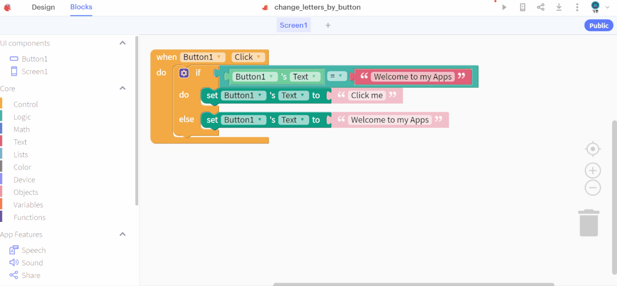 [4] 버튼을 눌렀을 때, 버튼의 글자(Button1's Text)가 "Welcome to my Apps"와 같다면, 버튼의 글자를 "Click me"로 변경해 줍니다.