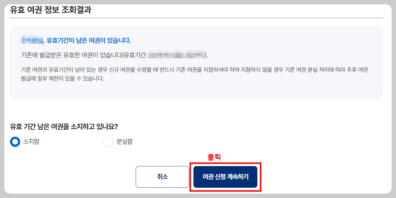 5.여권 조회결과를 보고, 여권 소지 여부를 체크하고 "여권 신청 계속하기"를 클릭합니다.