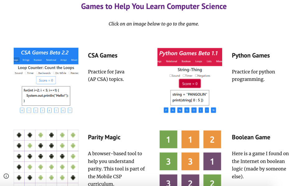 - APCSA(자바 AP시험), 파이썬, 기타 코딩 문법을 웹 게임을 하면서 재밌게 공부할 수 있는 사이트를 소개합니다.