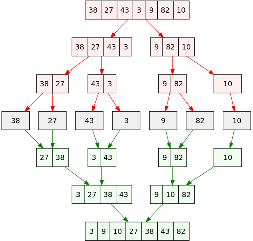 - 병합 정렬은 배열을 쪼갠 뒤, 다시 병합시키면서 차근차근 정렬해나가는 방식을 사용한다