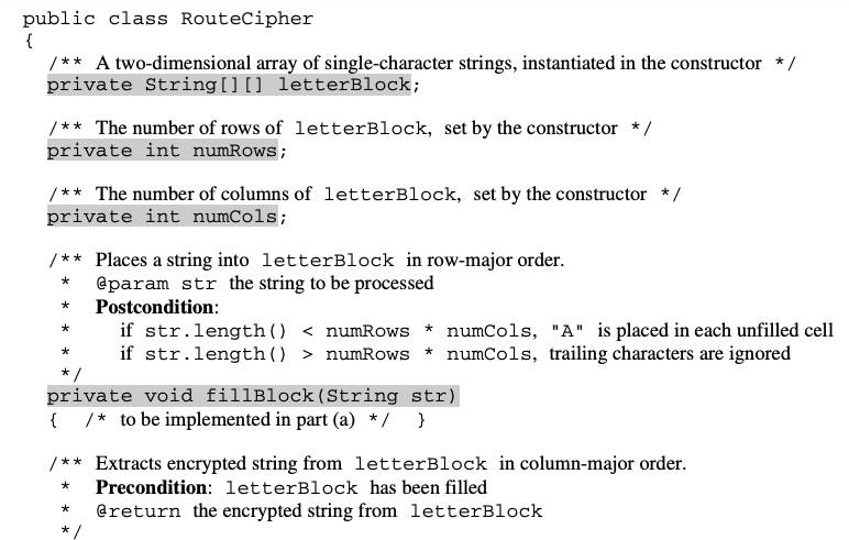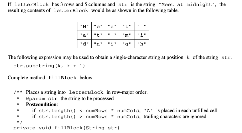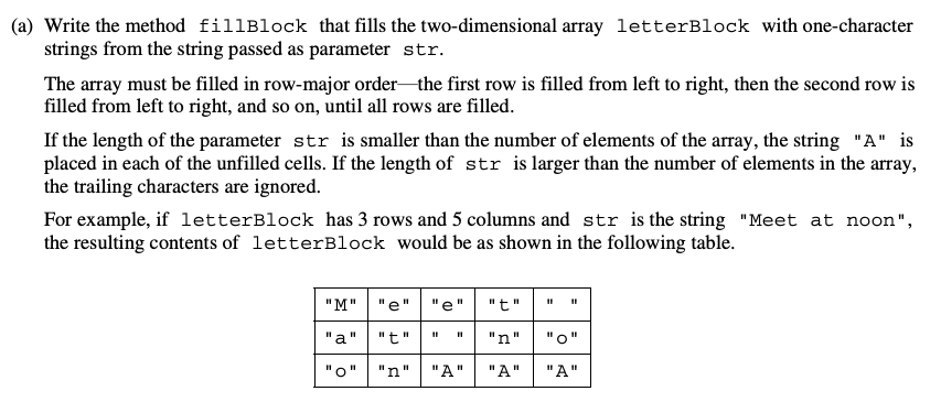 1 2 3 4 5 6 7 8 9 10 11 12 13 14 15 16 17 18 19 20 21 22 23 24 25 26 27 28 29 | // Part (a): private void fillBlock(String str) { int pos = 0; for (int r = 0; r < this.numRows; r++ ) { for (int c = 0; c < this.numCols; c++ ) { if (pos < str.length()) { this.letterBlock[r][c] = str.substring(pos, pos+1); pos++; } else { this.letterBlock[r][c] = "A"; } } } } // Alternative solution private void fillBlock(String str) { for (int r = 0; r < this.numRows; r++ ) { for (int c = 0; c < this.numCols; c++ ){ if (str.length() > (c + (r * this.numCols))) { this.letterBlock[r][c] = str.substring(c + r * this.numCols, 1 + c + r * this.numCols); } else { this.letterBlock[r][c] = "A"; } } } } | cs |