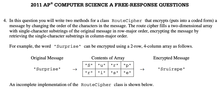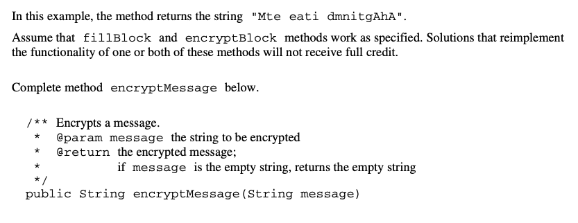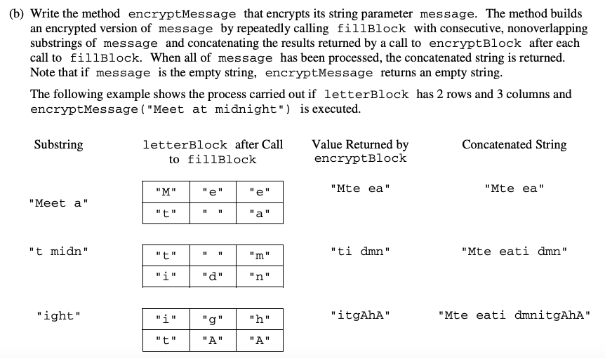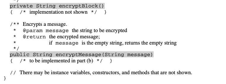 1 2 3 4 5 6 7 8 9 10 11 12 13 14 15 16 17 18 19 20 21 22 23 24 25 26 | // Part (b): public String encryptMessage(String message) { String encryptedMessage = ""; int chunkSize = this.numRows * this.numCols; while (message.length() > 0) { if (chunkSize > message.length()) { chunkSize = message.length(); } fillBlock(message); encryptedMessage += encryptBlock(); message = message.substring(chunkSize); } return encryptedMessage; } // Alternative solution public String encryptMessage(String message) { if (message.length() == 0) return ""; fillBlock(message); if (message.length() <= this.numRows * this.numCols) { return encryptBlock(); } return (encryptBlock() + encryptMessage(message.substring(this.numRows * this.numCols))); } | cs |
