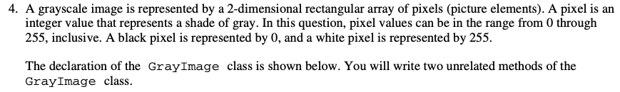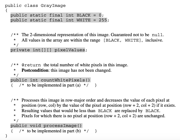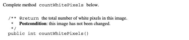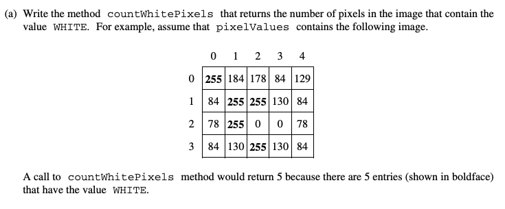 1 2 3 4 5 6 7 8 9 10 11 12 13 14 15 16 17 18 19 20 21 22 23 24 25 | // Part (a): public int countWhitePixels() { int whitePixelCount = 0; for (int[] row : this.pixelValues) { for (int pv : row) { if (pv == this.WHITE) { whitePixelCount++; } } } return whitePixelCount; } // Part (a): Alternative solution public int countWhitePixels() { int whitePixelCount = 0; for (int row = 0; row < pixelValues.length; row++) { for (int col = 0; col < pixelValues[0].length; col++) { if (pixelValues[row][col] == WHITE) { whitePixelCount++; } } } return whitePixelCount; } | cs |