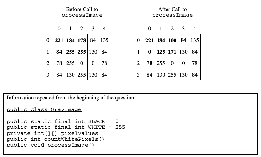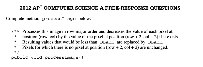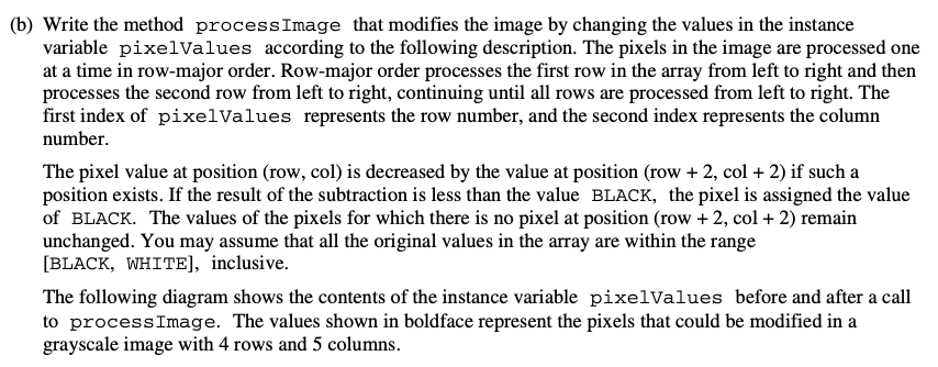 1 2 3 4 5 6 7 8 9 10 11 12 13 14 15 16 17 18 19 20 21 22 23 24 25 | // Part (b): public void processImage() { for (int row = 0; row < this.pixelValues.length-2; row++) { for (int col = 0; col < this.pixelValues[0].length-2; col++) { this.pixelValues[row][col] -= this.pixelValues[row+2][col+2]; if (this.pixelValues[row][col] < BLACK) { this.pixelValues[row][col] = BLACK; } } } } // Part (b): Alternative solution public void processImage() { for (int row = 0; row < this.pixelValues.length; row++) { for (int col = 0; col < this.pixelValues[0].length; col++) { if (row + 2 < pixelValues.length && col + 2 < pixelValues[row].length) { this.pixelValues[row][col] -= this.pixelValues[row+2][col+2]; if (this.pixelValues[row][col] < BLACK) { this.pixelValues[row][col] = BLACK; } } } } } | cs |