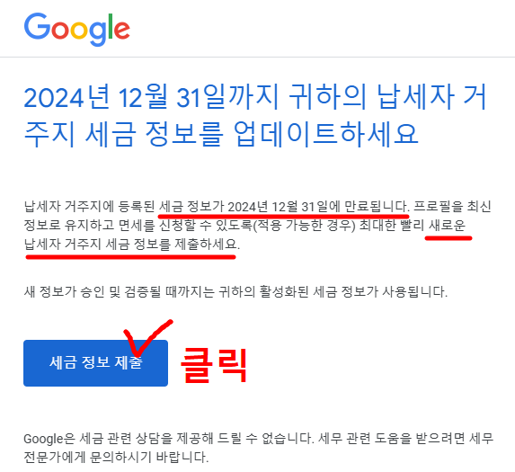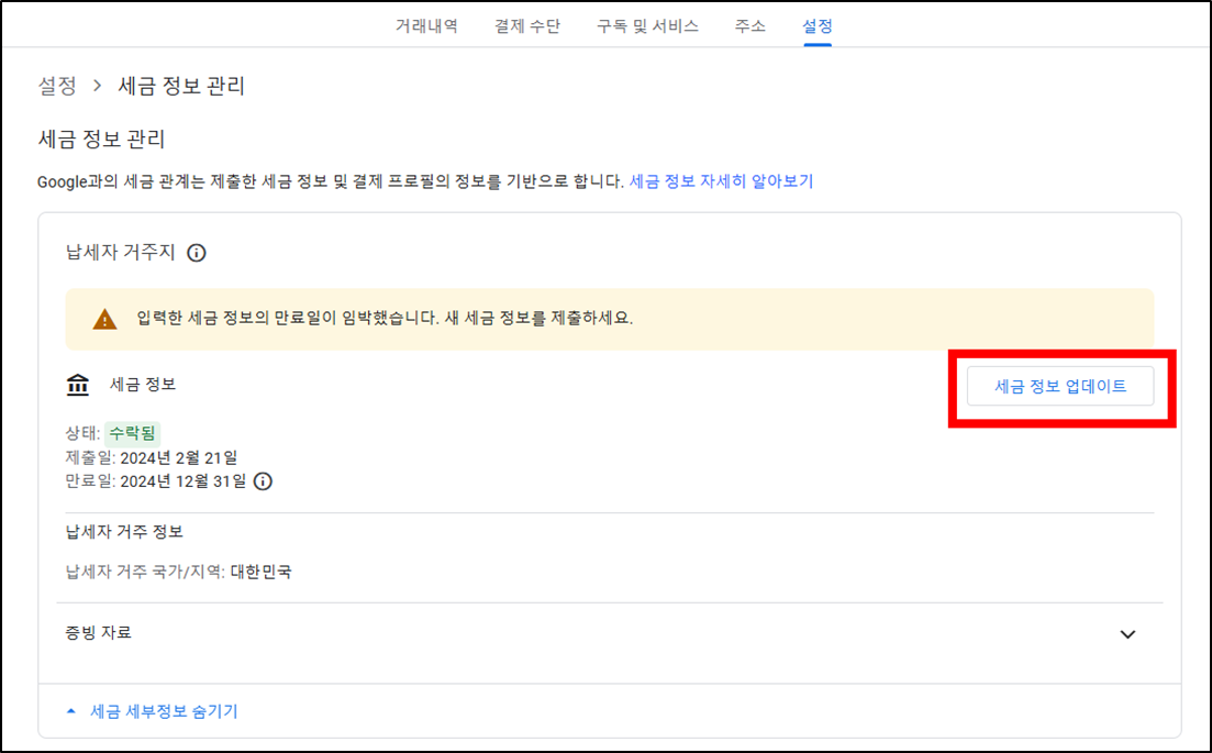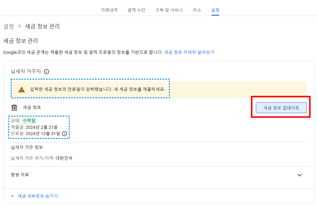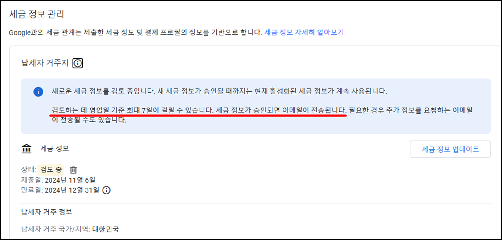이후에 지메일을 통해서 승인되었는지 확인하시면 세금 정보 업데이트가 최종 완료된 것입니다.