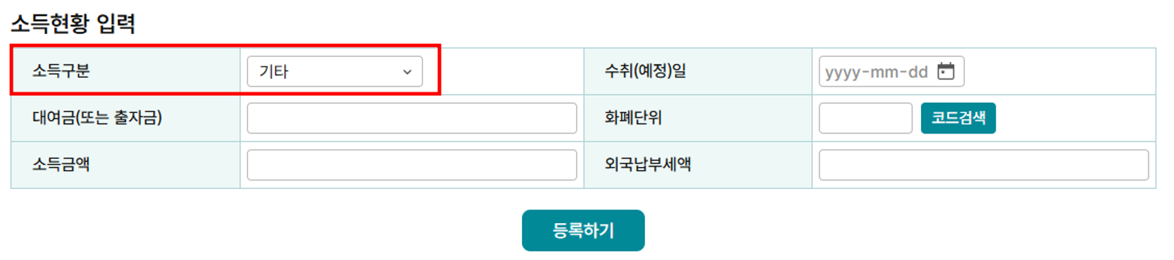 [소득현황 입력]에 "소득구분"에 "기타"를 선택해주세요. 나머지는 안해도 됩니다.