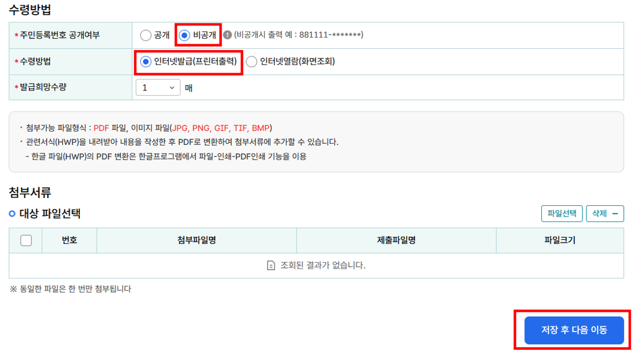 [수령방법]에서 주민번호는 비공개로, 수령방법은 인터넷발급으로, 첨부서류는 할것 없습니다.