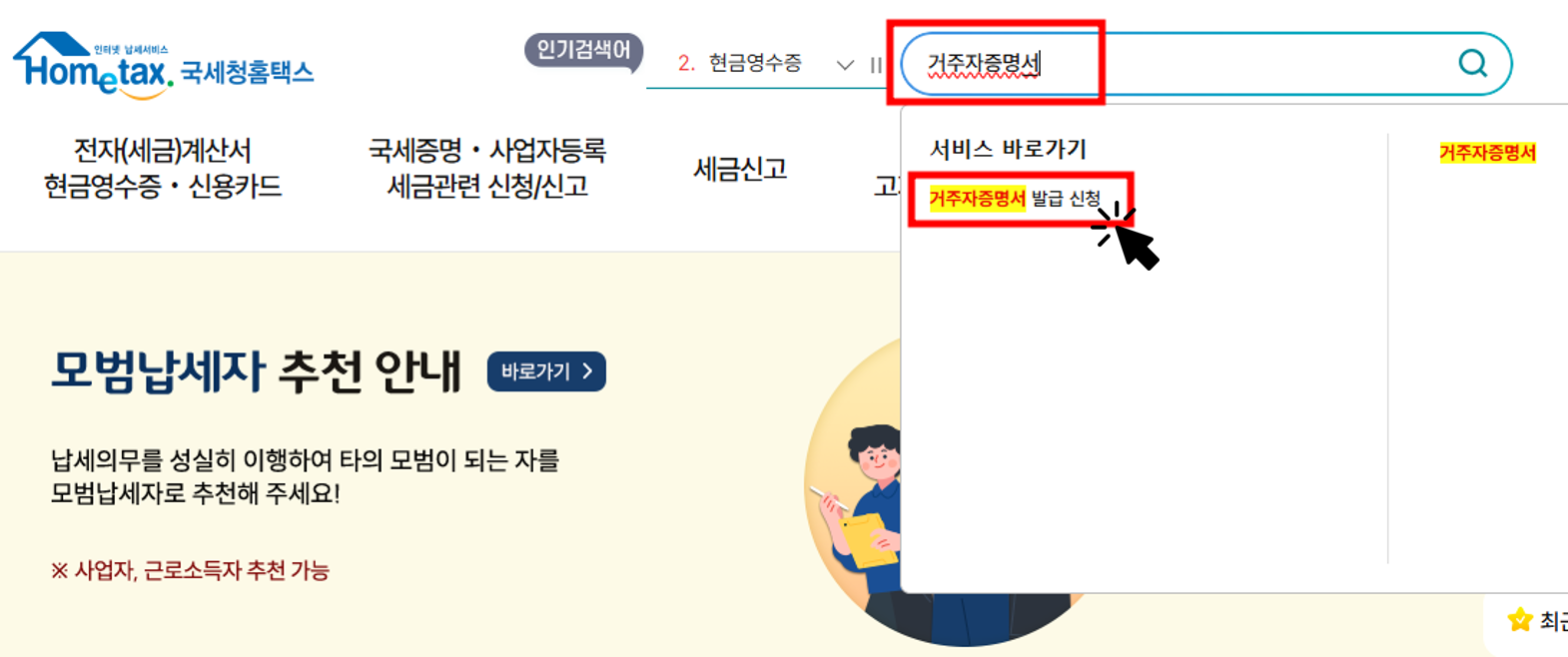 (2) 홈택스 사이트에 로그인을 해주세요. 그리고 홈택스 첫 화면 상단의 검색창에 "거주자증명서"를 입력하여 뜨는 "거주자증명서 발급 신청"글자를 클릭하면 발급 신청 페이지로 넘어가게 됩니다.