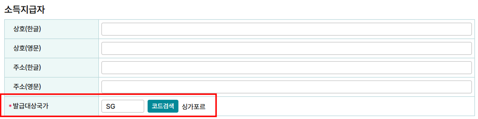 [소득지급자]에서 "발급대상국가"는 "코드검색"버튼을 눌러 싱가포르로 입력해주시면 됩니다.