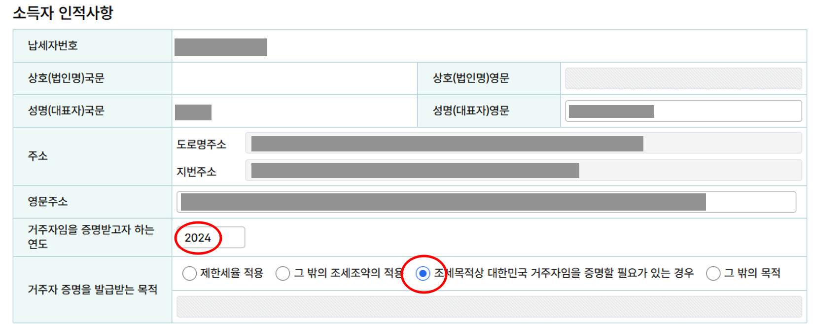 [소득자 인적사항]도 아래 회색 네모칸을 기입해주시고, "연도"는 올해 년도로, "발급받는 목적"에 "조세목적상 대한민국...."을 클릭해주시면 되겠습니다.