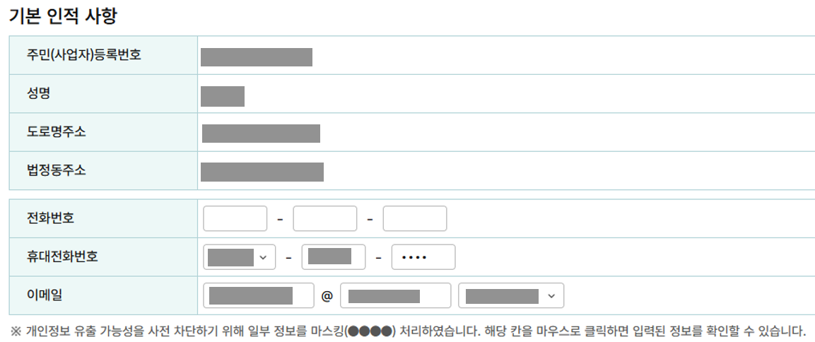 [기본 인적 사항]은 기본적으로 입력된 거는 그대로 두시고 아래와 같이 회색 네모친 곳이 채워지게 해주세요.