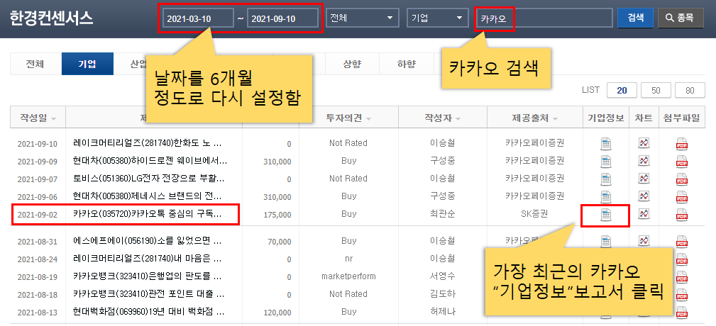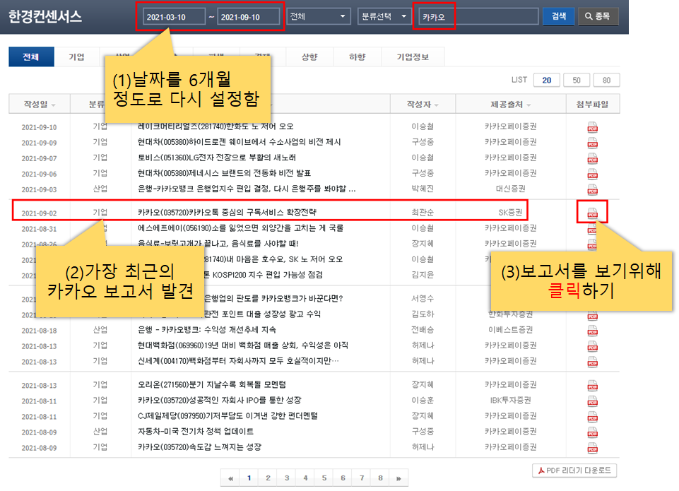 위 이미지에 설명된 순서대로 카카오의 최신 보고서 하나를 클릭하여 들어가 봅니다.