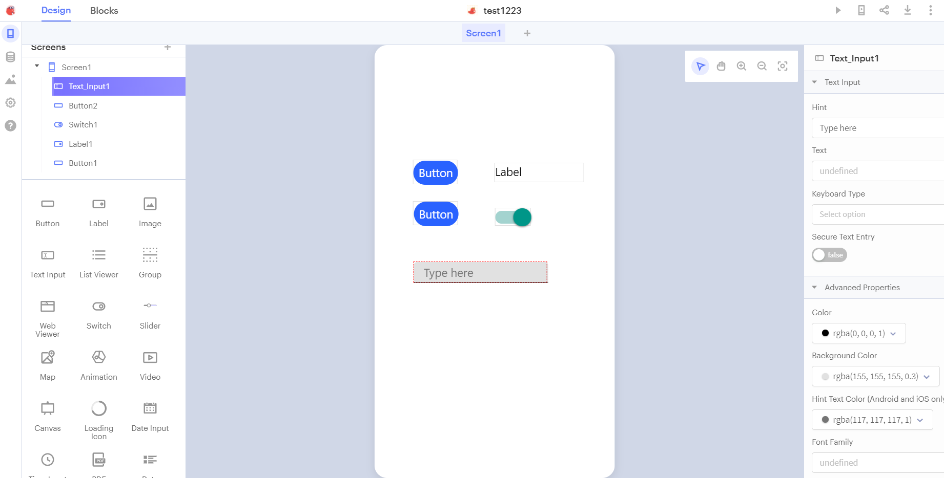 위 이미지는 앱 개발을 위한 디자인 화면입니다. 화면 왼쪽에 있는 버튼(Button) 등의 요소를 마우스로 끌어다가 가운데 스마트폰 화면에 놓으면서 화면 디자인을 하는 것입니다. 화면 디자인이 끝나면 왼쪽 상단의 "Blocks"를 눌러 코딩(컴퓨터 명령어를 이용하여 동작 프로그램을 만드는 것)을 할 수 있는 화면으로 넘어갑니다.