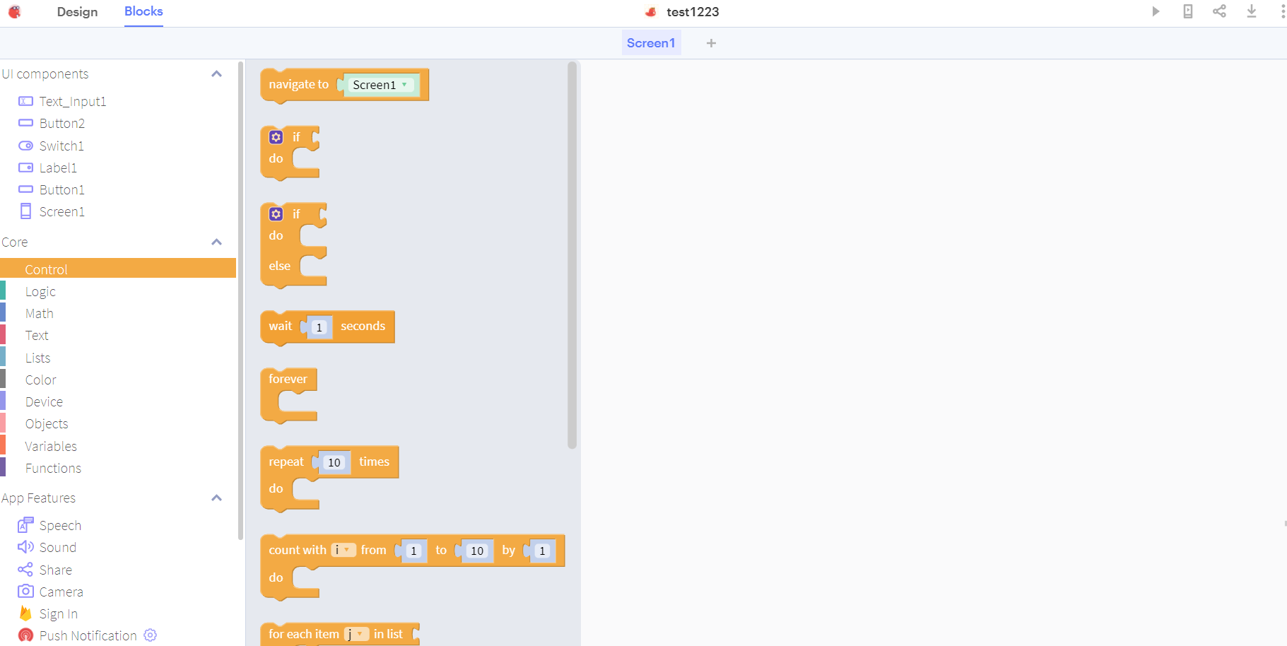 위 이미지는 앱 코딩 화면으로서 왼쪽에 있는 여러가지 카테고리를 클릭하면 컴퓨터 명령 블록들이 여러 개 나타납니다. 이 명령블록을 마우스로 끌어서 오른쪽 화면에 차곡차곡 쌓아서 앱을 동작시키는 프로그램을 만드는 것입니다.
