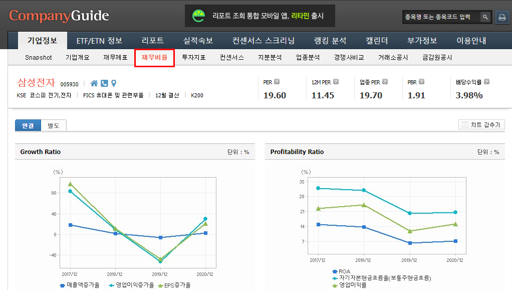 [2] 메뉴 상단의 "재무비율"로 들어가기