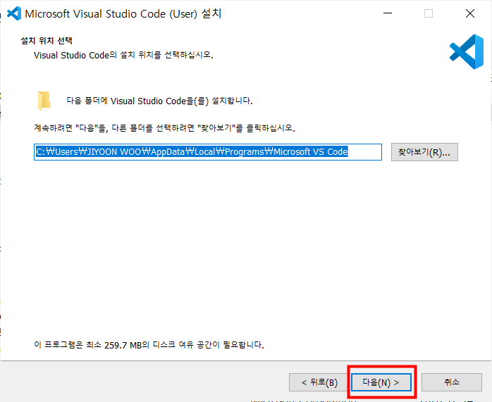 (4) 설치 위치를 정하는 부분입니다. 저는 첨부터 적혀있는데로 하겠습니다. 다음으로 넘어갑니다.