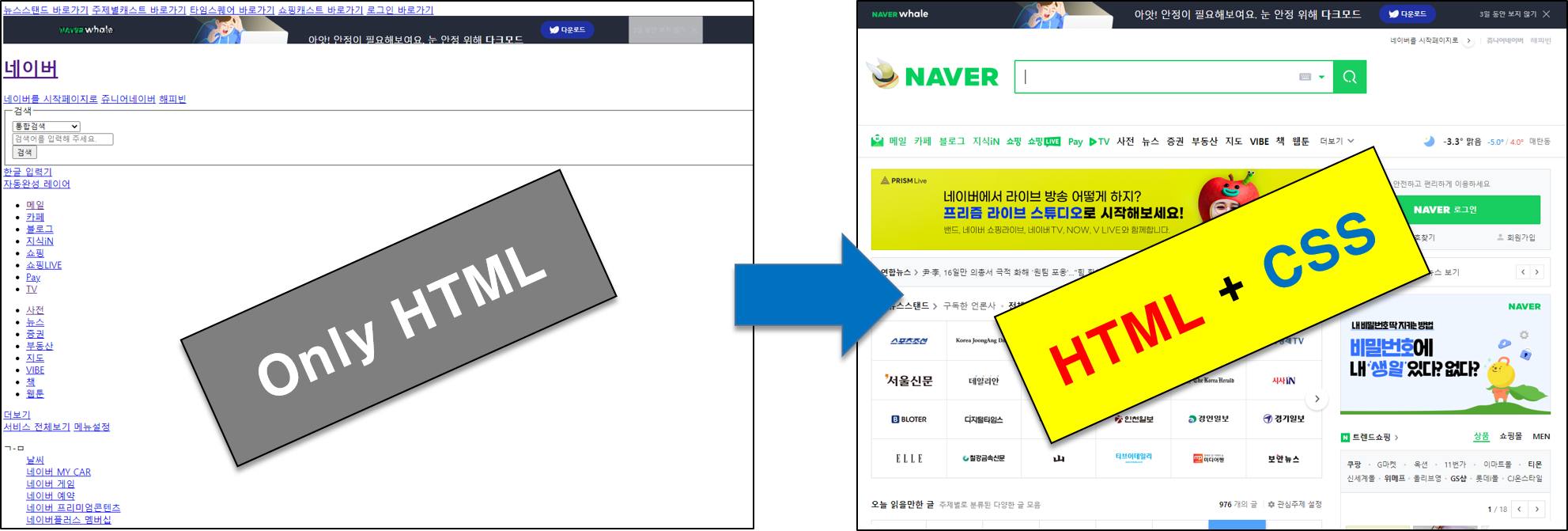 - HTML 문서에 CSS를 적용하면 우리가 일반적으로 보는 네이버 홈페이지가 됩니다.