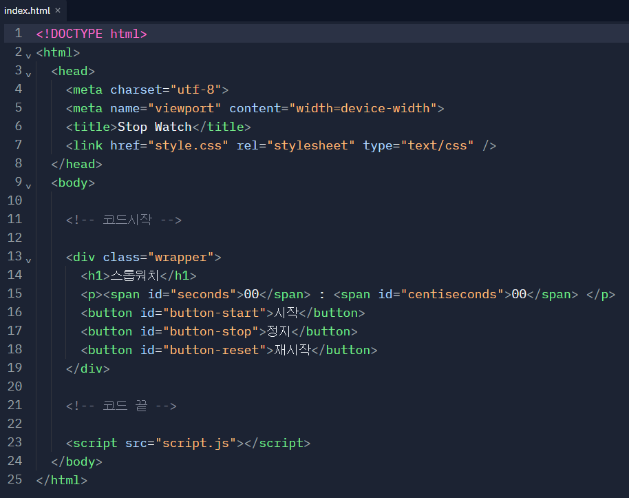 [3] 스톱워치를 작동시키기 위해서는 자바스크립트 코드를 작성해야 합니다. 다음과 같이 코딩해 주세요.