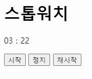 [4] 위의 자바스크립트를 작성하고 실행하면 아래와 같이 "시작", "정지", "재시작" 버튼을 누를시 작동이 잘 되는 것을 확인할 수 있습니다.