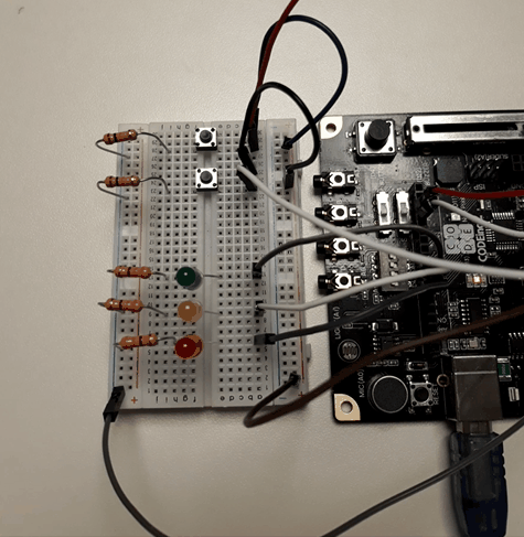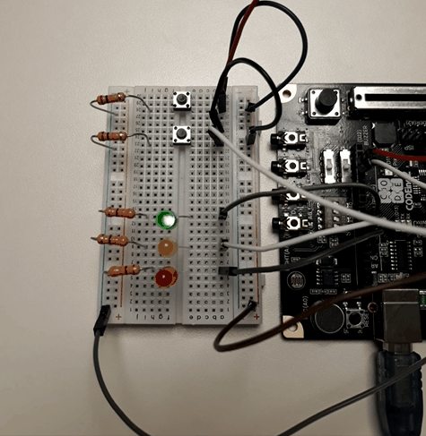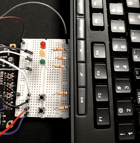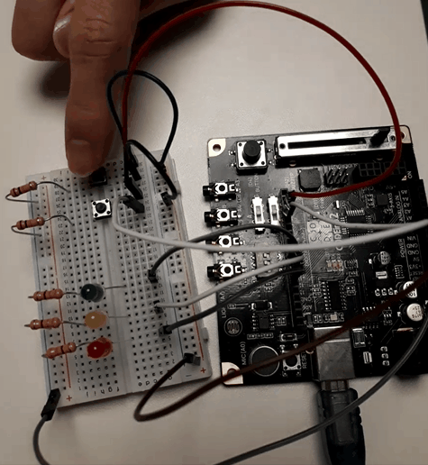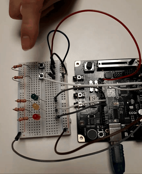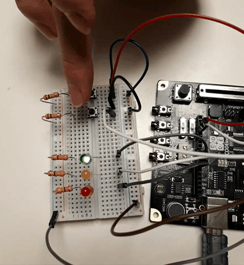 키보드 "5"를 누르면 1초 간격으로 빨간색-노란색-초록색 순으로 LED가 꺼진다.