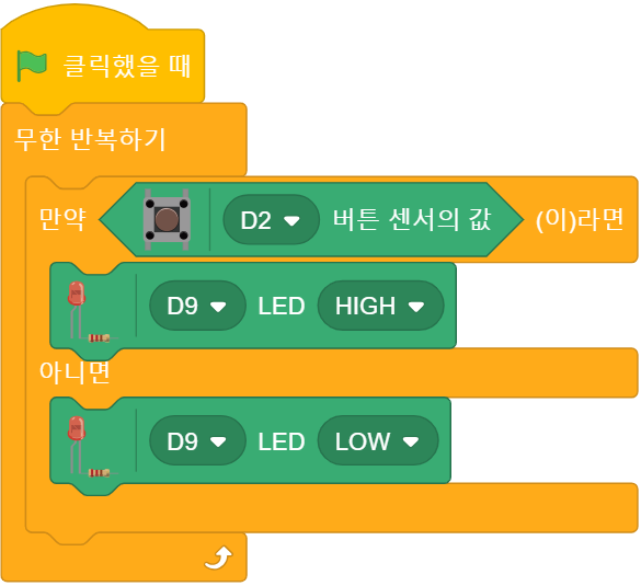 아래 그림과 같이 D2 버튼을 누르면 초록색(D9), 노란색(D10), 빨간색(D11) LED가 모두 켜지고, 버튼을 떼면 모두 꺼지게 코딩을 해보세요.