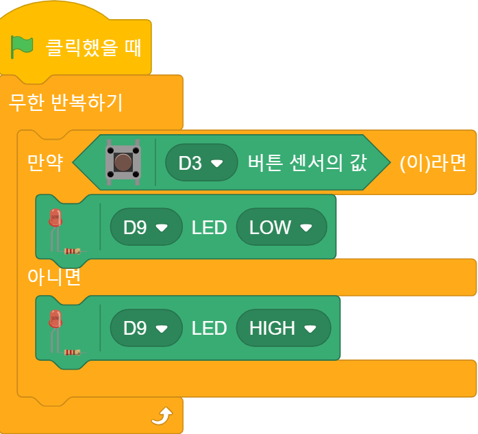 - LED의 현재 상태가 ON/OFF 인지를 "변수 LED"에 저장하게 했습니다.